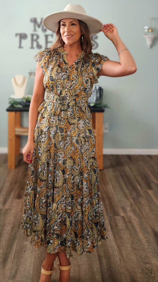 🖤Reset by Jane- Calypso Paisley Midi Dress- Boho Ruffle Detail