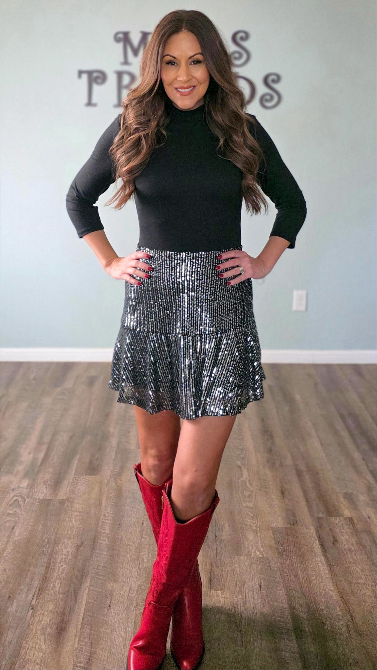 Step into the spotlight in this dazzling sequin skirt that’s ready for every celebration on your calendar. The shimmering gunmetal tone catches the light beautifully with every movement, making it the perfect choice for holiday parties, or any festive occasion where you want to shine.