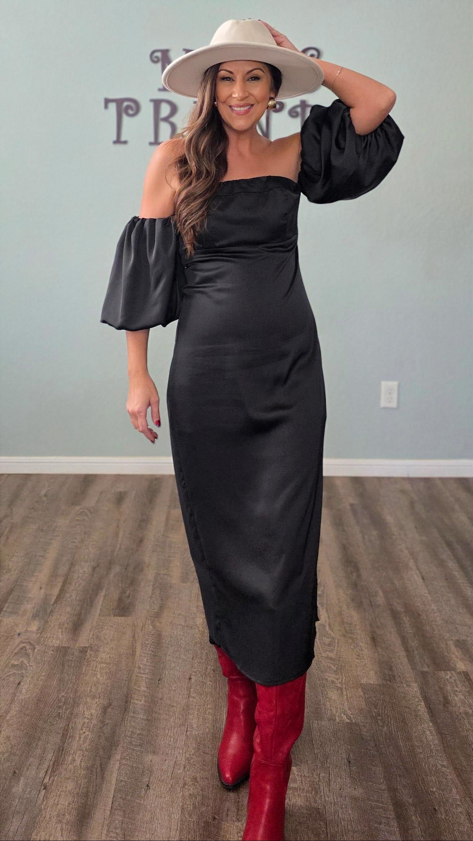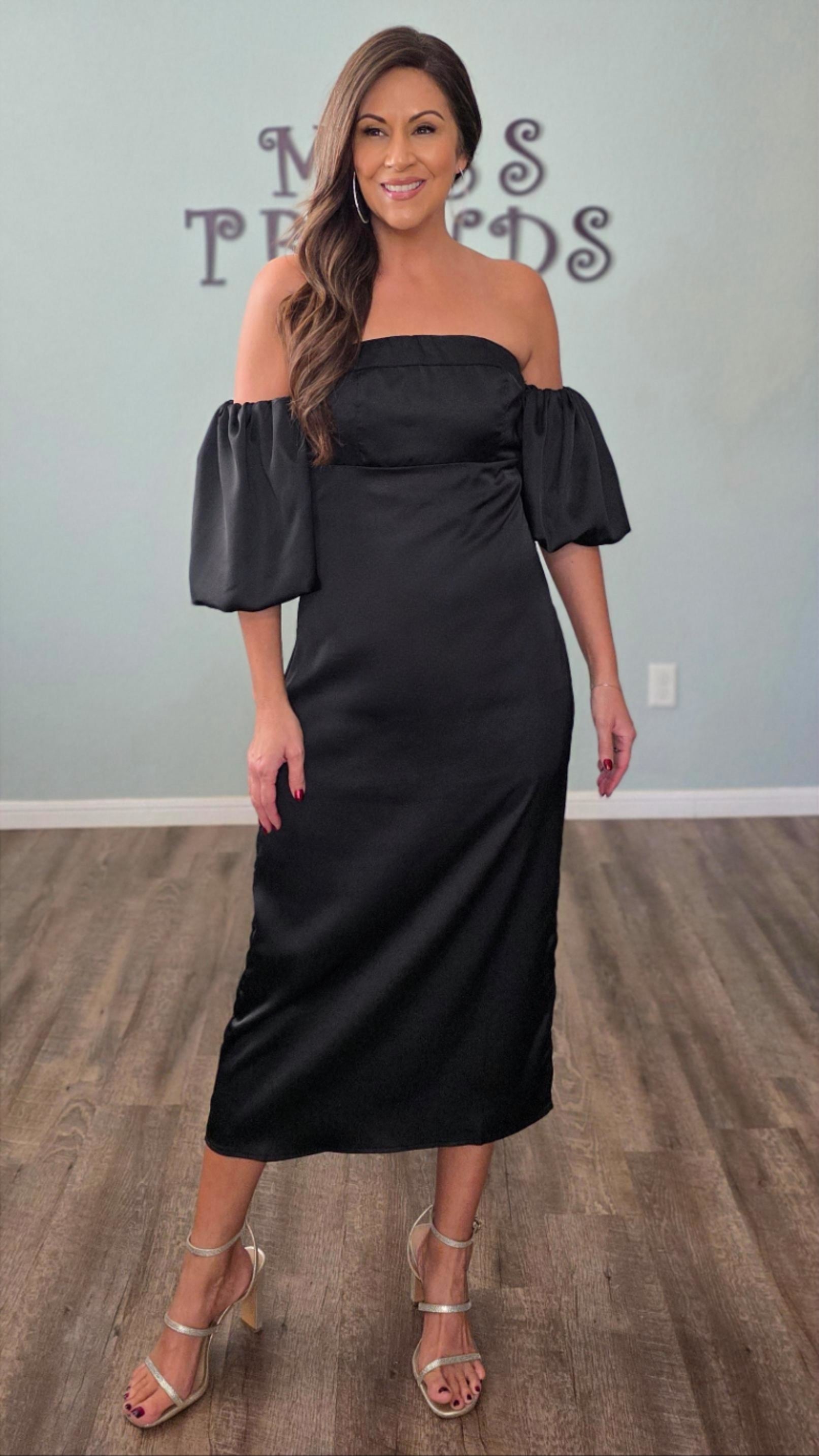 Make a striking entrance in this Satin Off Shoulder Puff Sleeve Midi Dress. Crafted from a smooth satin fabric, this dress features an elegant off shoulder neckline paired with voluminous puff sleeves for a refined yet bold look. The midi length adds a polished touch, making it a beautiful choice for weddings, holiday events, date nights, or any occasion that calls for something special.