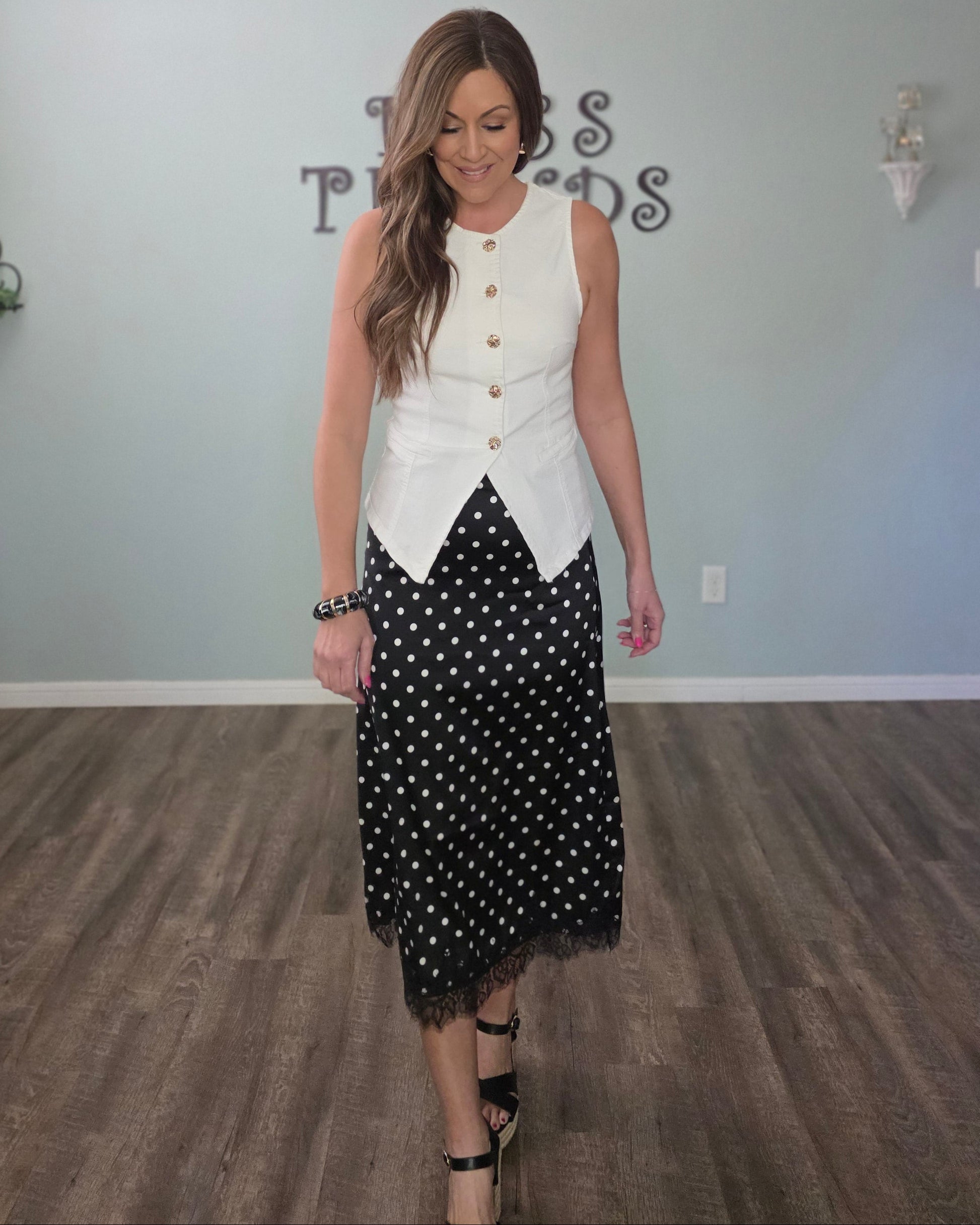 This classic polka dot satin midi skirt is the perfect blend of feminine and polished style. Designed with a soft, silky satin finish, it drapes beautifully for a flattering and effortless look. The delicate lace trim at the hem adds a subtle, romantic touch, making this piece feel elevated and special. Finished with an easy elastic waistband and a generous amount of stretch throughout, this skirt is as comfortable as it is stylish.