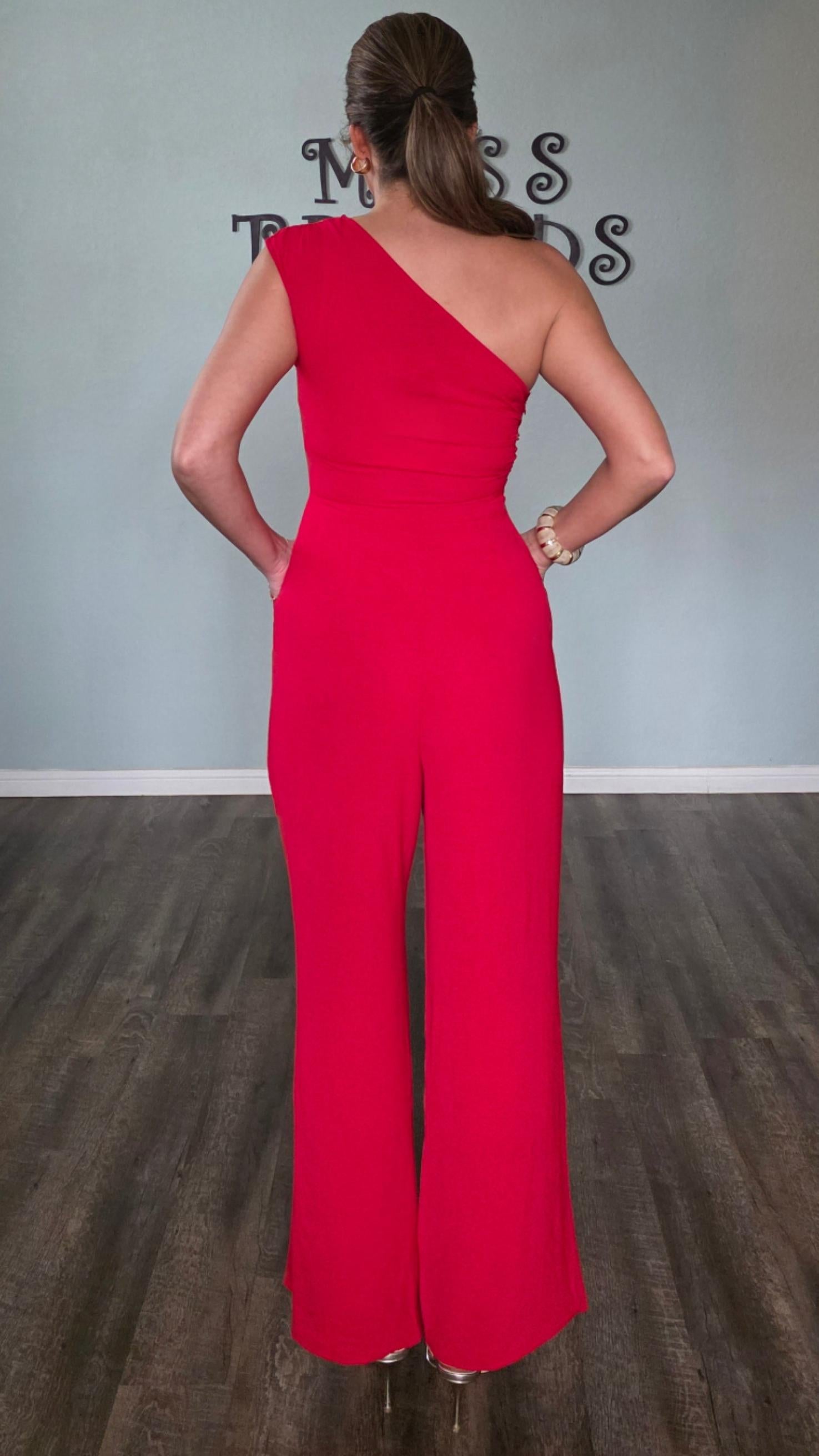 This vibrant red one shoulder jumpsuit is a standout piece that blends modern style with a flattering silhouette. Designed with soft ruching along the shoulder and side, it creates beautiful texture while giving the jumpsuit a sculpted, feminine shape. The defined waist enhances your figure while the wide leg design adds an elevated, elongated look.
