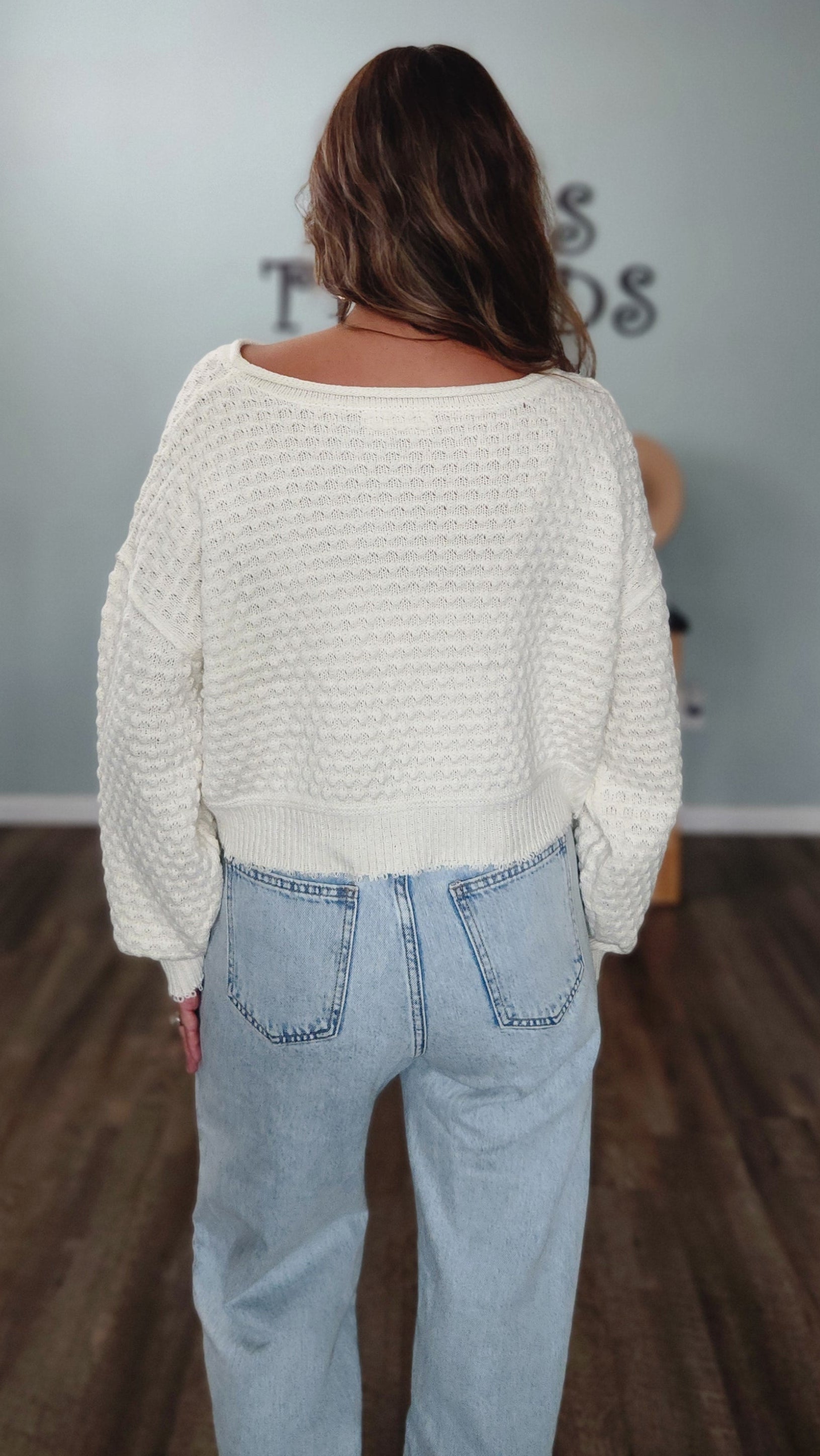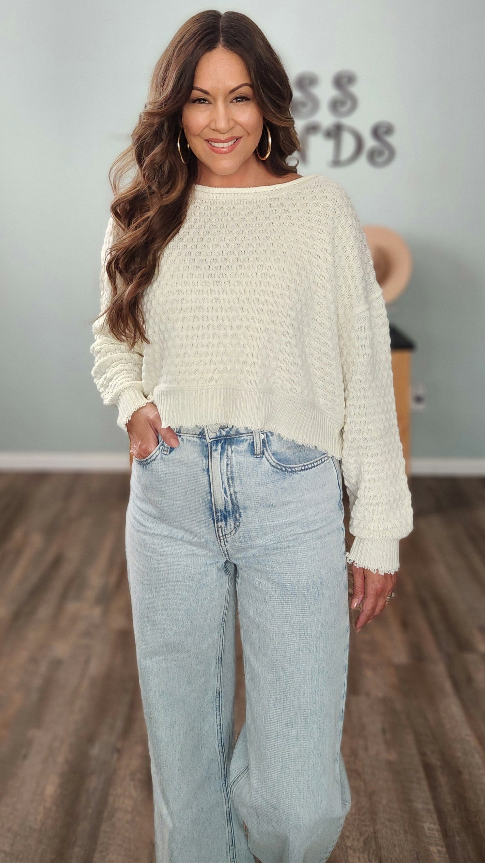 This cozy cream waffle knit sweater is the definition of effortless comfort meets style. The textured honeycomb knit gives it that boutique-quality look, while the relaxed cropped fit makes it perfect for pairing with high-waisted denim, a skirt or layering under a jacket. The raw hem adds just the right touch of edge, making this the go-to piece your customers will reach for again and again.