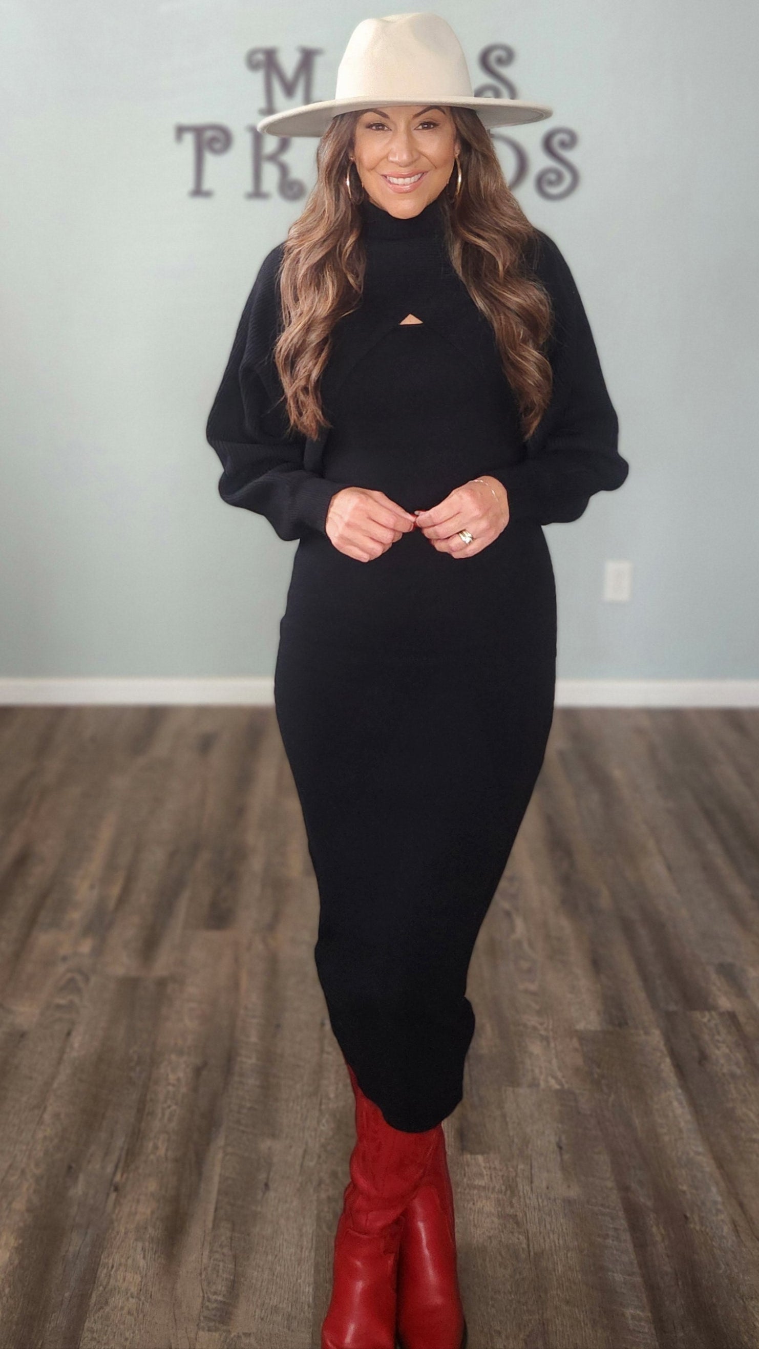 Elegant, classy, and endlessly versatile. This sleek black midi dress comes with a coordinating cropped sweater that you can wear layered for a polished set or style each piece on its own. Whether you’re keeping it casual with sneakers or dressing it up for an evening out, this two-in-one look delivers timeless sophistication every time.