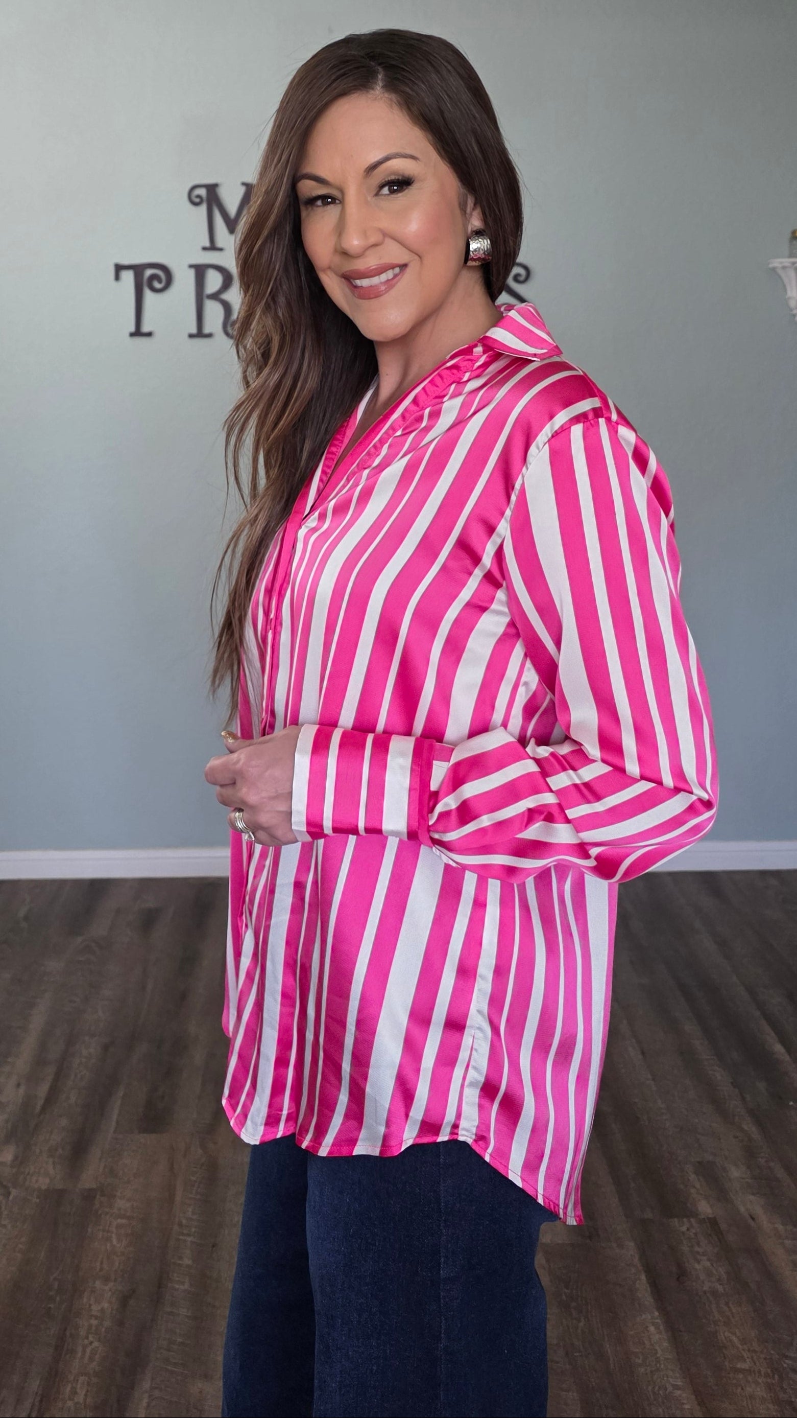 Umgee Satin Vertical Stripe Button Down Top – Hot Pink/White
